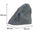 Naturtro kunstig sten i quartzite-look, fremstillet i let og robust fiberglasforstærket plast. Perfekt til have, havedam, scenografi eller skjul af installationer. Velegnet til både indendørs og udendørs brug året rundt. Mål: Højde 44 cm, bredde 50 cm, dybde 40 cm – vægt kun 3,75 kg.