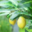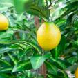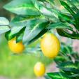 Citron træ med flotte solmodne citroner og lianer der snor sig rundt om stammen.