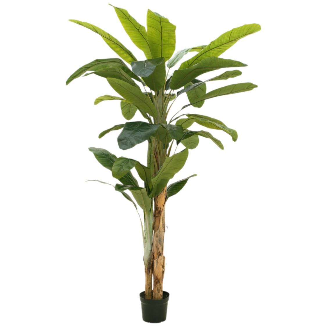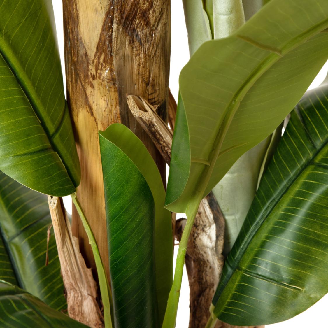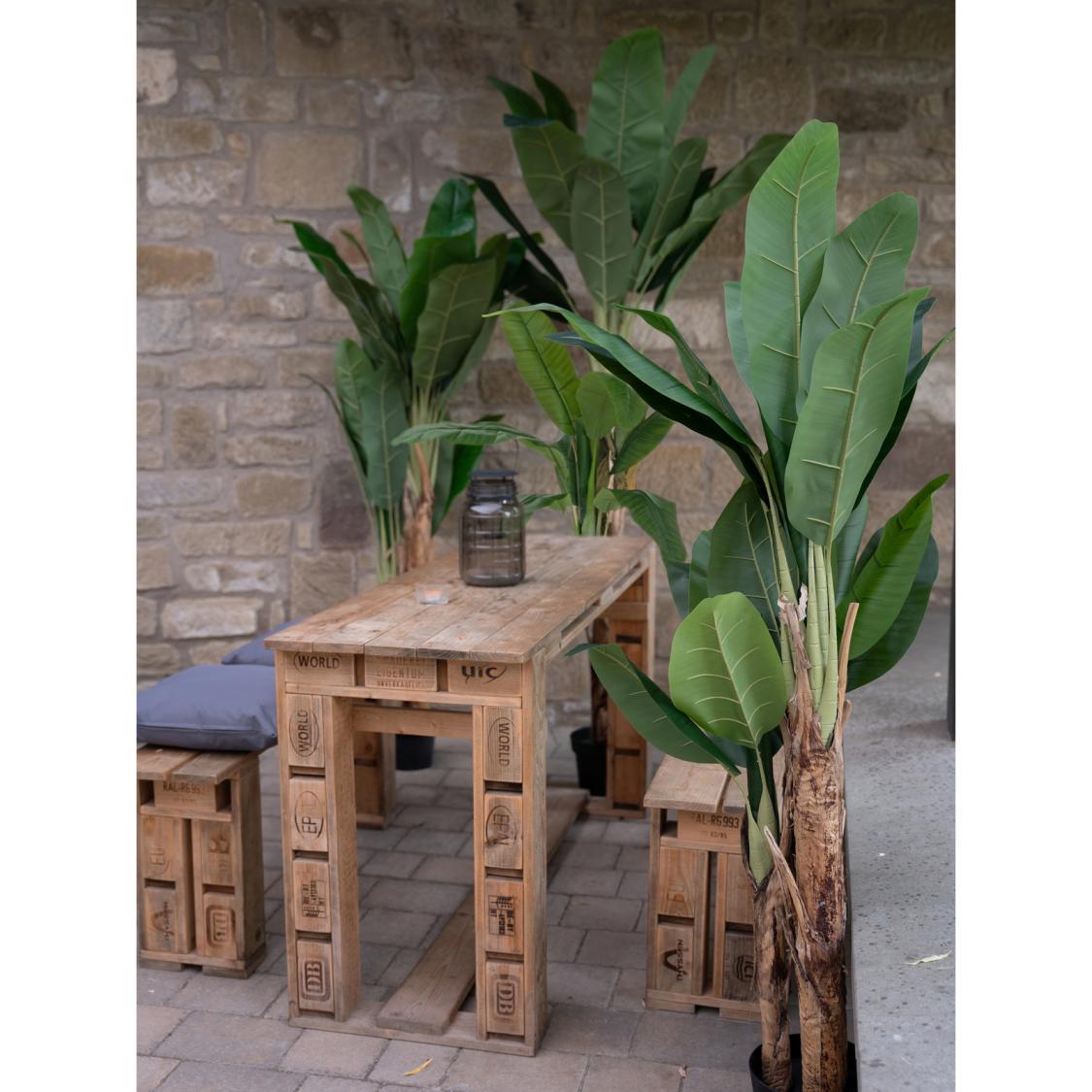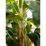 Whether for your wellness area, the winter garden, a hotel complex or your private rooms; the 3-stem banana tree from Europalms is ideal as an easy-care decorative element. Thanks to the impressive overall height of approx. 240 cm, the subtropical-looking artificial plant cannot be overlooked. Its trunks are wrapped in dried banana bark. This gives the subtropical-looking artificial plant a very natural appearance. The dense leafage of the shrub was made of waterproof tarpaulin with the typical leaf embossing. As an option, we recommend treating the leaves at regular intervals with a UV-protection spray so that you can enjoy your banana plant for a long time. The banana tree has a total height of approx. 120 cm and is supplied in a basic gardener's pot, which gives the plant a stable stand when placed in a planter.