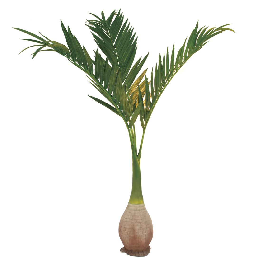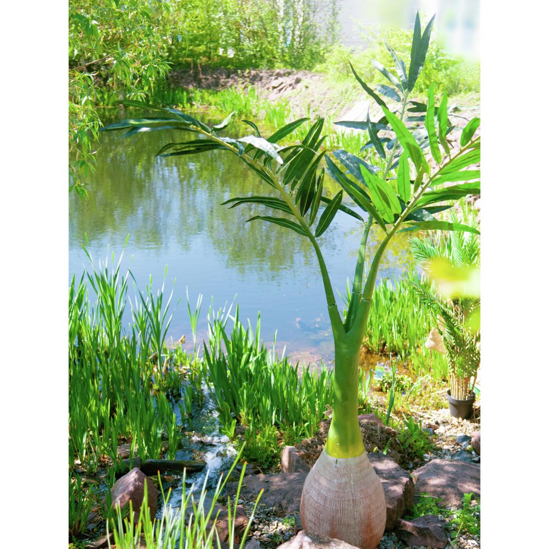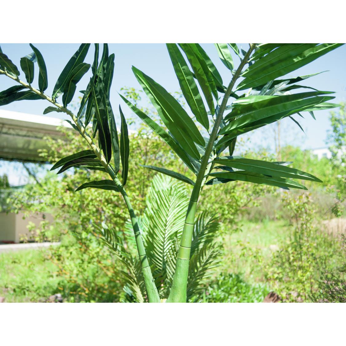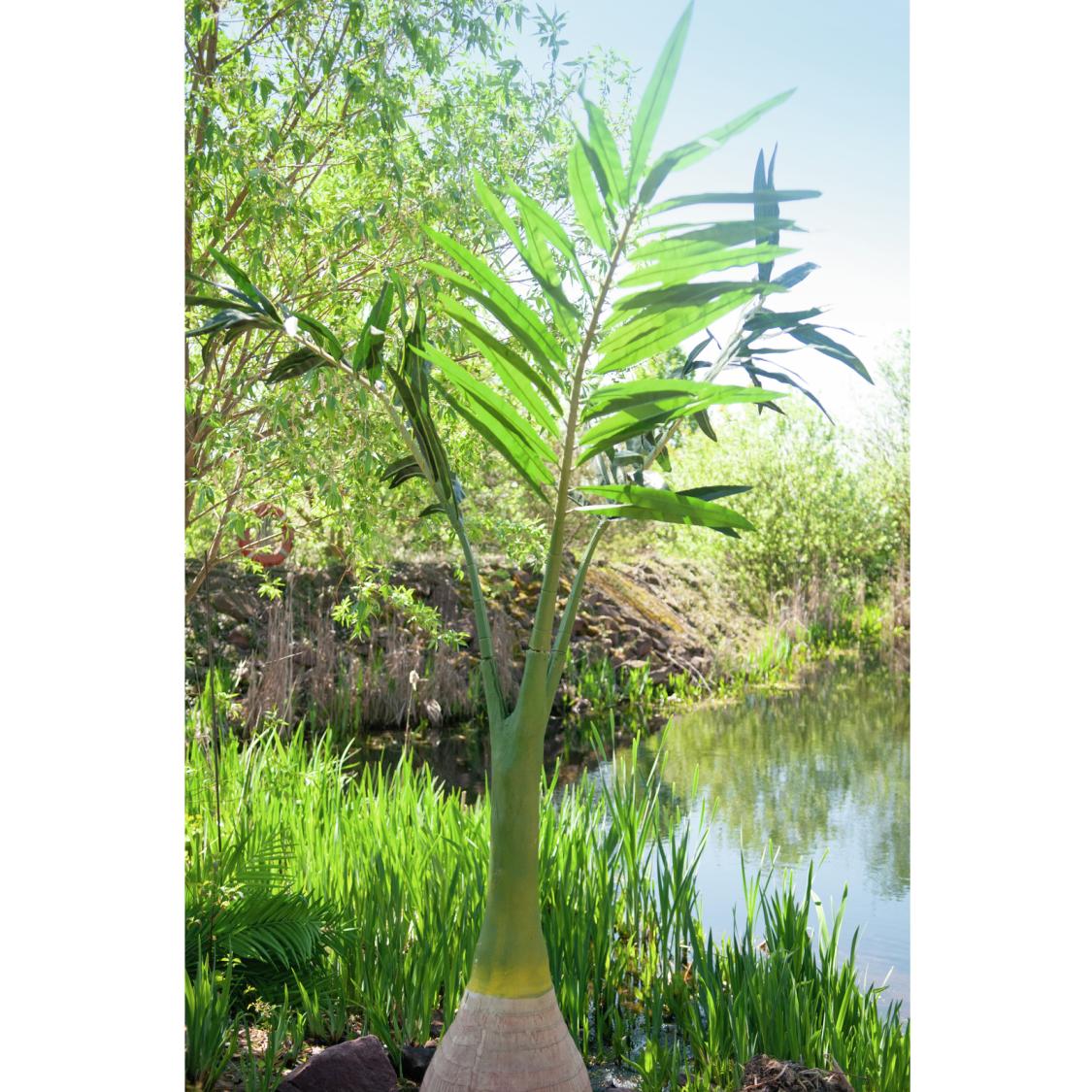 The fronds have a stable shaft made of metal and are simply plugged in. From the bottom to the top of the leaf, the plant has a total height of approx. 240 cm. If a flame retardant treatment according to DIN 4102/B1 is required, the textile leaves of the fronds can be treated with an appropriate fire protection spray.