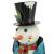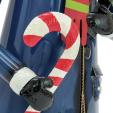Snowman holding a little tree in his left and a candy cane in his right hand